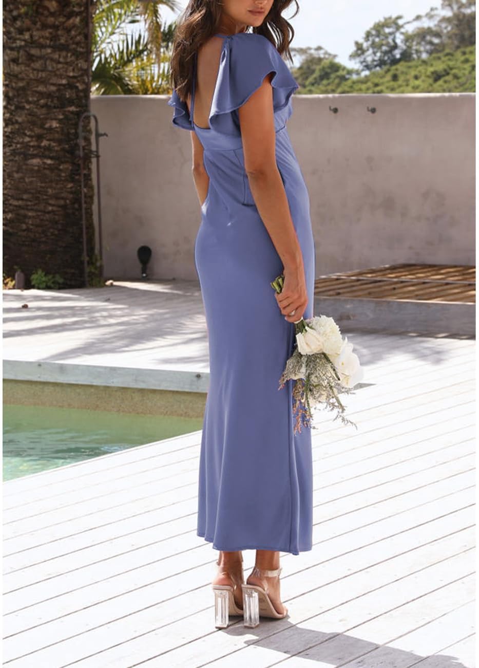 Satin V Neck Flutter Sleeve Backless Formal Wedding Guest Dresses for Women