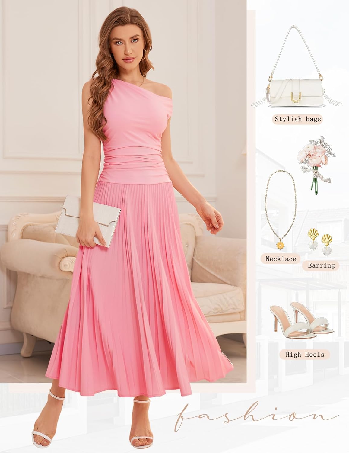 Maxi Formal One Shoulder Pleated Dress for Women Wedding Guest Bridesmaid