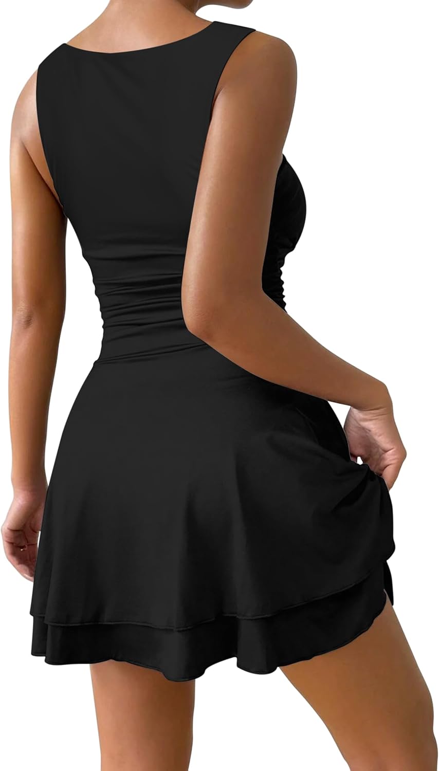 IWD Women’s Square Neck Sleeveless Mini Dress Ruched Waist Tiered Ruffle Hem A Line Short Dresses