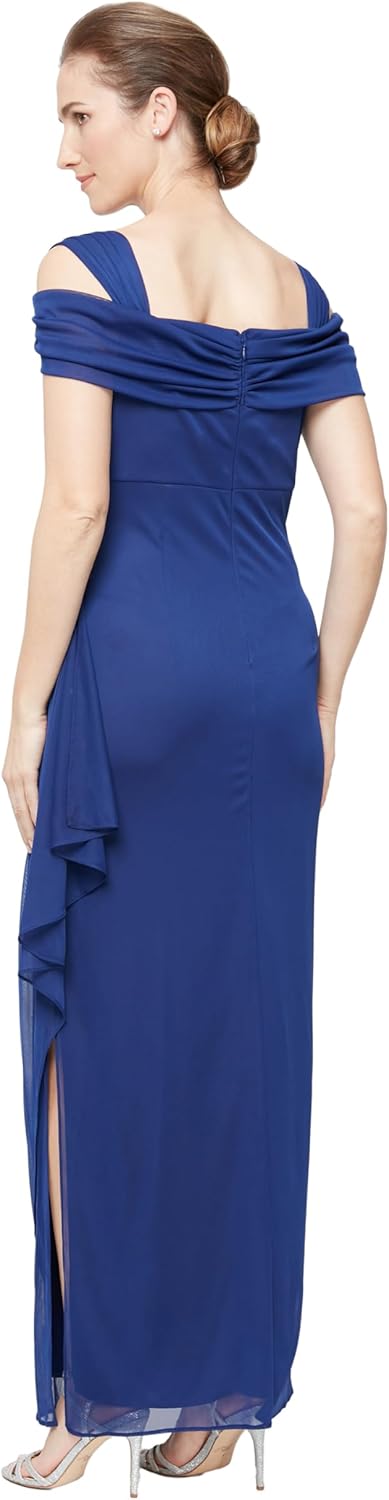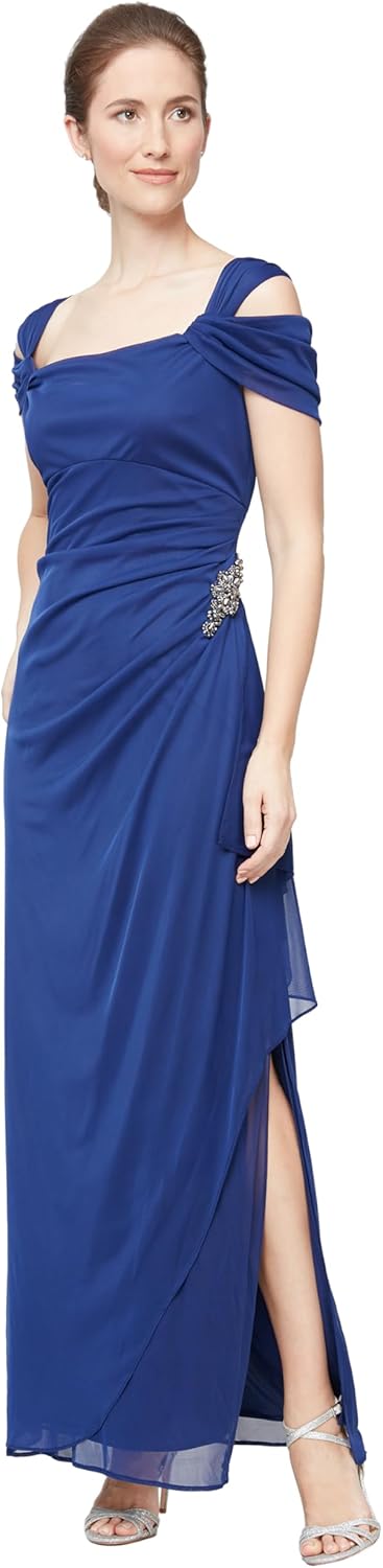 Alex Evenings was founded on one simple idea: that eveningwear should reflect YOU, the amazing woman wearing it.Floor skimming skirt cold shoulder dress with beaded waist detail and cowl neckline.