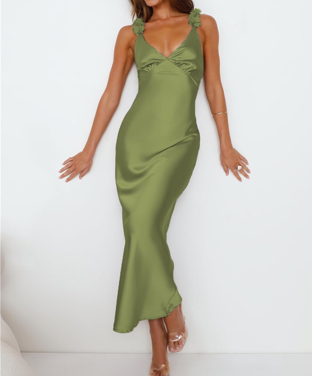 Summer Satin V Neck Backless Formal Dress for Women Wedding Guest
