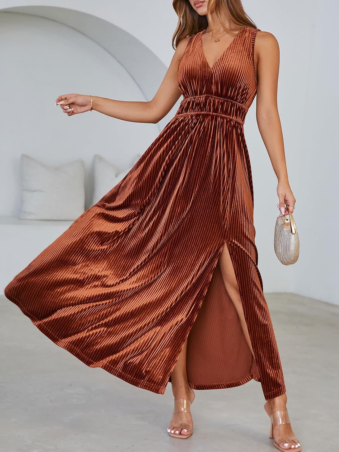 The video showcases the product in use.The video guides you through product setup.The video compares multiple products.The video shows the product being unpacked. maxi dress women velvet with sleeveless Merchant Video